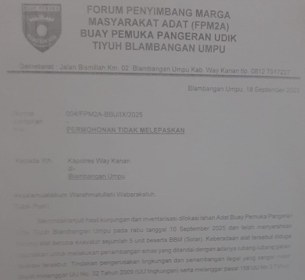 Way Kanan – Tekanan terhadap Polres Way Kanan semakin keras. Empat tokoh adat Blambangan Umpu resmi melayangkan surat desakan agar aparat tidak main-main dalam menangani kasus 5 eskavator dan puluhan mesin tambang ilegal (TI) yang berhasil diamankan masyarakat pada Minggu (18/9).